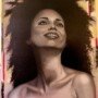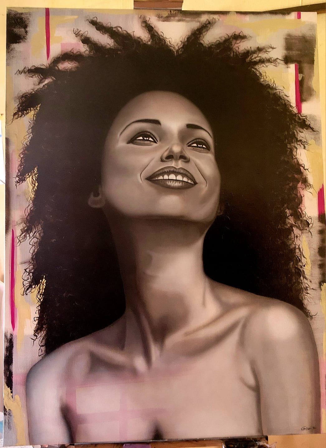 Le traitement en clair-obscur met en valeur les volumes du visage, du cou et des épaules, tandis que la chevelure afro, ample et dynamique, crée un contraste puissant et structure la composition. Les dégradés subtils apportent douceur et réalisme à la peau, tandis que le fond, plus libre et légèrement coloré, ajoute une touche contemporaine et expressive.