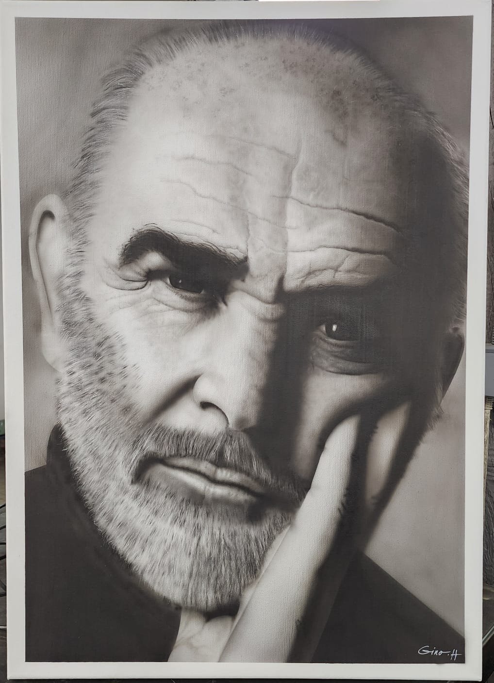 Réalisé à l’aérographe et à l’acrylique, le portrait combine des dégradés extrêmement doux pour les volumes et la lumière, avec un travail plus précis à l’acrylique pour les détails comme la barbe, les rides et les regards. Cette technique mixte apporte à la fois finesse, profondeur et réalisme saisissant.
